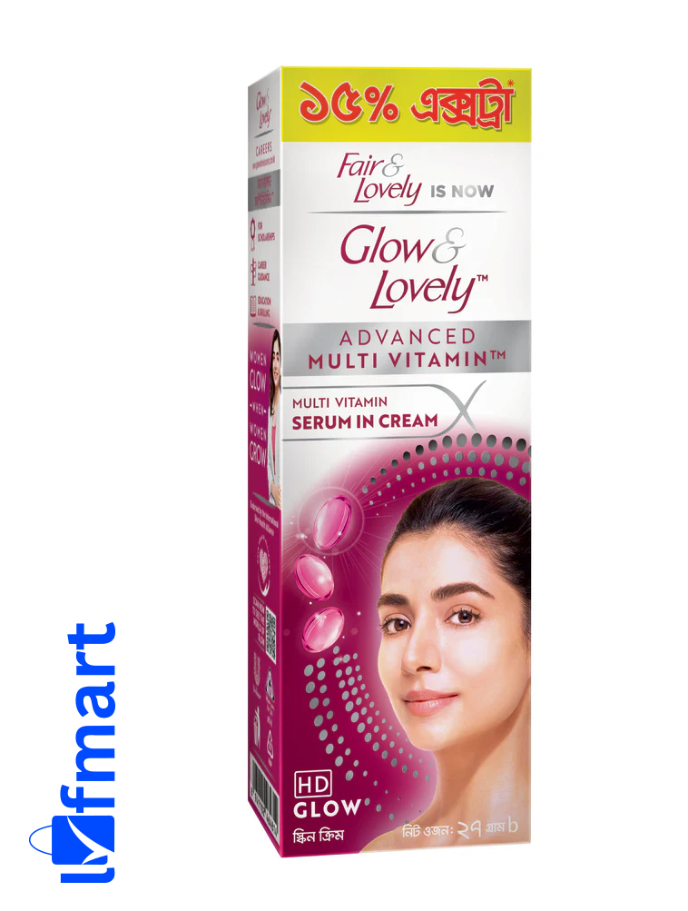 গ্লো অ্যান্ড লাভলি অ্যাডভান্সড মাল্টিভিটামিন ফেস ক্রিম, যা পূর্বে ফেয়ার অ্যান্ড লাভলি নামে পরিচিত ছিল, একটি দৈনিক ময়েশ্চারাইজার যা আপনাকে একটি উজ্জ্বল আভা দেয় – ত্বকের স্বচ্ছতা, উজ্জ্বলতা এবং উজ্জ্বলতা।
